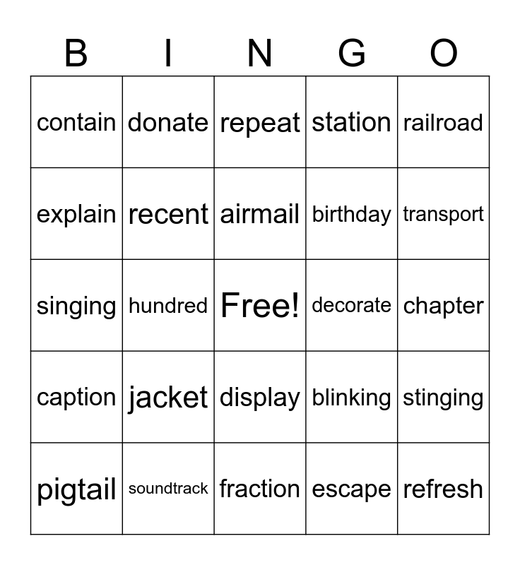 This bingo card has a free space and 24 words: jacket, soundtrack, airmail, pigtail, railroad, contain, explain, donate, decorate, display, birthday, singing, blinking, stinging, recent, escape, chapter, repeat, transport, hundred, refresh, caption, station and fraction.