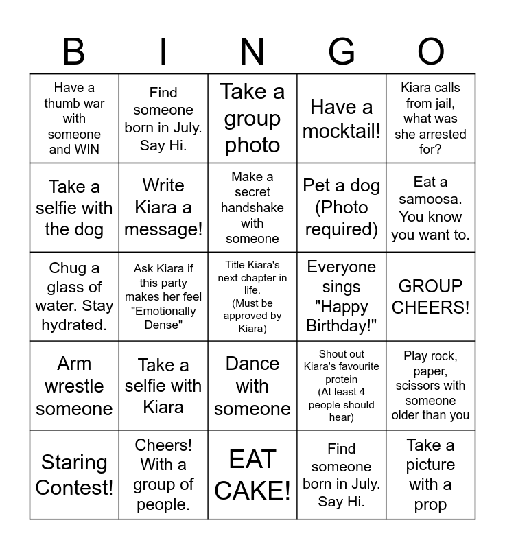 This bingo card has 25 words: Take a selfie with Kiara, EAT CAKE!, Make a secret handshake with someone, Staring Contest!, Kiara calls from jail, what was she arrested for?, Have a thumb war with someone and WIN, Take a selfie with the dog, Find someone born in July. Say Hi., Everyone sings "Happy Birthday!", Dance with someone, Pet a dog (Photo required), Chug a glass of water. Stay hydrated., Shout out Kiara's favourite protein (At least 4 people should hear), Play rock, paper, scissors with someone older than you, Write Kiara a message!, Take a picture with a prop, GROUP CHEERS!, Take a group photo, Eat a samoosa. You know you want to., Ask Kiara if this party makes her feel "Emotionally Dense", Title Kiara's next chapter in life. (Must be approved by Kiara), Cheers! With a group of people., Arm wrestle someone, Have a mocktail! and Find someone born in July. Say Hi..