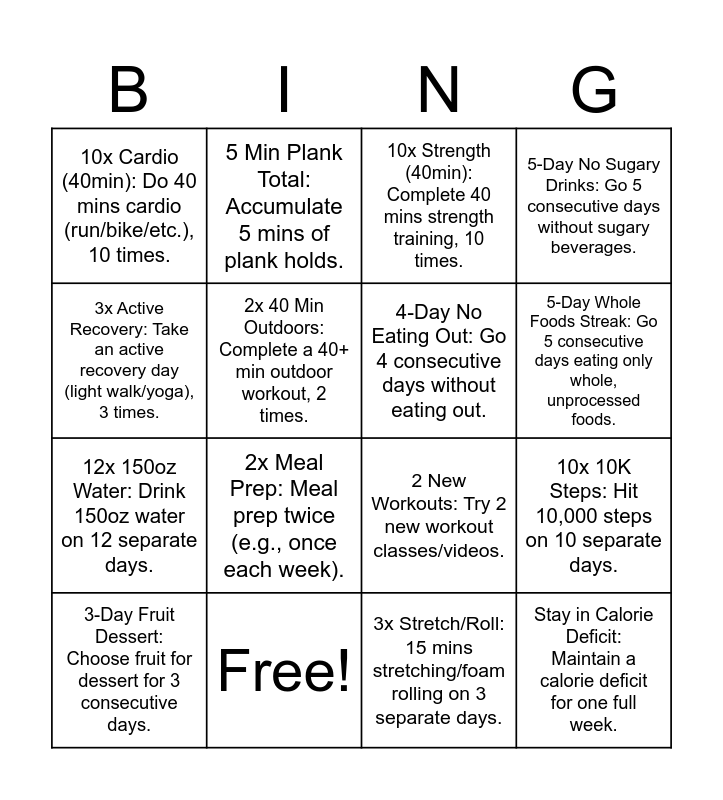 This bingo card has 16 words: Free!, 10x 10K Steps: Hit 10,000 steps on 10 separate days., 10x Strength (40min): Complete 40 mins strength training, 10 times., 10x Cardio (40min): Do 40 mins cardio (run/bike/etc.), 10 times., 12x 150oz Water: Drink 150oz water on 12 separate days., 5 Min Plank Total: Accumulate 5 mins of plank holds., 2 New Workouts: Try 2 new workout classes/videos., 3x Stretch/Roll: 15 mins stretching/foam rolling on 3 separate days., 3x Active Recovery: Take an active recovery day (light walk/yoga), 3 times., 2x 40 Min Outdoors: Complete a 40+ min outdoor workout, 2 times., 3-Day Fruit Dessert: Choose fruit for dessert for 3 consecutive days., 5-Day No Sugary Drinks: Go 5 consecutive days without sugary beverages., 2x Meal Prep: Meal prep twice (e.g., once each week)., 5-Day Whole Foods Streak: Go 5 consecutive days eating only whole, unprocessed foods., 4-Day No Eating Out: Go 4 consecutive days without eating out. and Stay in Calorie Deficit: Maintain a calorie deficit for one full week..