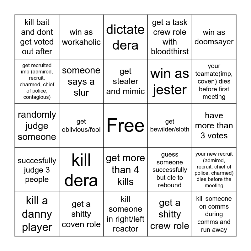 This bingo card has a free space and 24 words: kill dera, get a shitty coven role, get stealer and mimic, kill a danny player, win as doomsayer, kill bait and dont get voted out after, get recruited imp (admired, recruit, charmed, chief of police, contagious), win as workaholic, get bewilder/sloth, get more than 4 kills, win as jester, randomly judge someone, guess someone successfully but die to rebound, your new recruit (admired, recruit, chief of police, charmed) dies before the meeting, someone says a slur, get a shitty crew role, have more than 3 votes, dictate dera, your teamate(imp, coven) dies before first meeting, get oblivious/fool, kill someone on comms during comms and run away, succesfully judge 3 people, get a task crew role with bloodthirst and kill someone in right/left reactor.