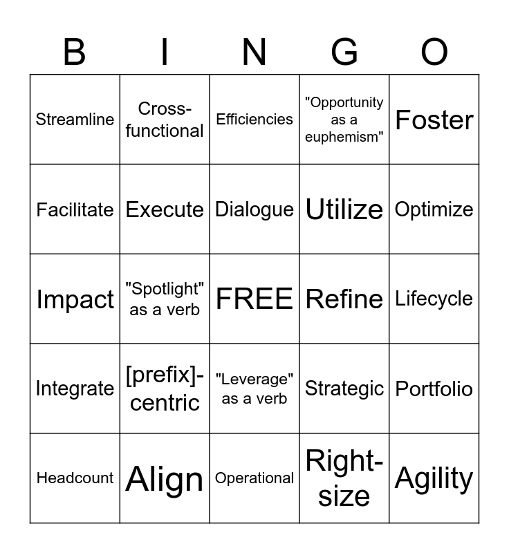 This bingo card has a free space and 37 words: Intersection, Prospects, Pipeline, Execute, Portfolio, [prefix]-centric, Dialogue, Transformative, Foster, Accelerate, "Spotlight" as a verb, "Opportunity as a euphemism", Agility, Lifecycle, Facilitate, Integrate, Prioritize, Efficiencies, "Leverage" as a verb, Refine, Streamline, Optimize, Headcount, Operational, "Key" as an adjective, Right-size, Cross-functional, Implications, Transition, Conversation, Clarity/clarify, Align, Impact, Initiative, Strategic, Utilize and Sprint.