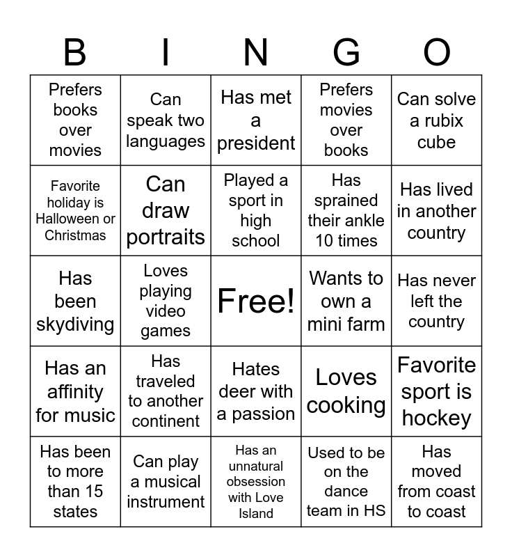This bingo card has a free space and 24 words: Has traveled to another continent, Can play a musical instrument, Played a sport in high school, Has been to more than 15 states, Can solve a rubix cube, Prefers books over movies, Favorite holiday is Halloween or Christmas, Can speak two languages, Wants to own a mini farm, Hates deer with a passion, Has sprained their ankle 10 times, Has been skydiving, Loves cooking, Favorite sport is hockey, Can draw portraits, Used to be on the dance team in HS, Has never left the country, Has met a president, Has lived in another country, Loves playing video games, Has moved from coast to coast, Has an affinity for music, Prefers movies over books and Has an unnatural obsession with Love Island.