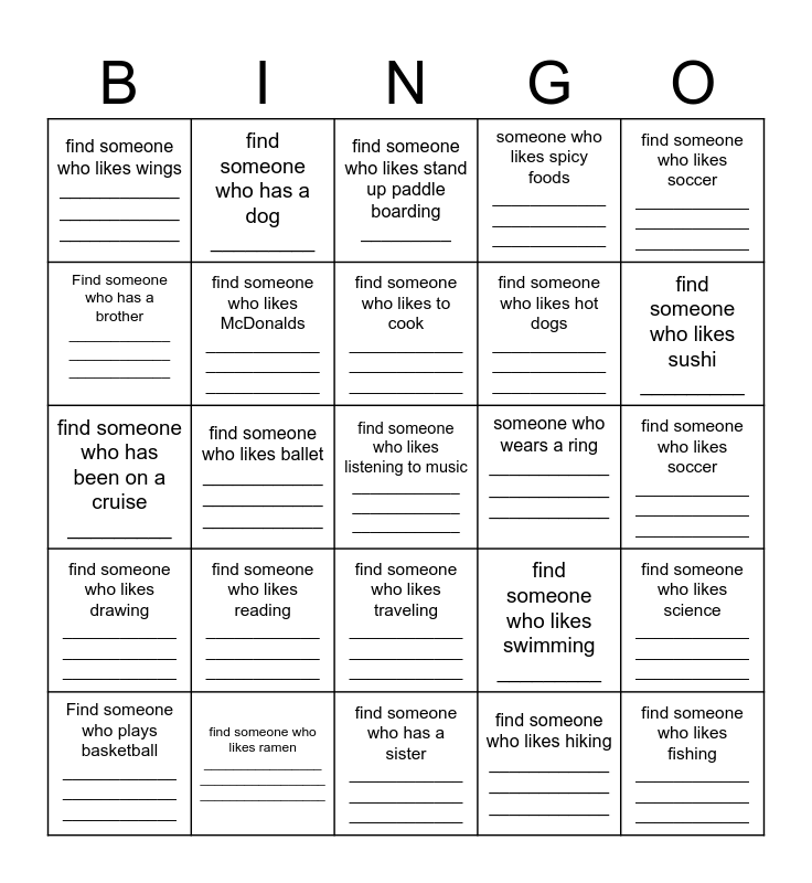 This bingo card has 31 words: Find someone who plays basketball ____________ ____________ ____________, Find someone who has a cat ____________ ____________ ____________, find someone who likes to cook ____________ ____________ ____________, find someone who likes seafood ____________ ____________ ____________, find someone who likes soccer ____________ ____________ ____________, find someone who likes wings ____________ ____________ ____________, find someone who likes McDonalds ____________ ____________ ____________, find someone who likes traveling ____________ ____________ ____________, find someone who likes hot dogs ____________ ____________ ____________, find someone who likes video games ____________ ____________ ____________, find someone who likes drawing ____________ ____________ ____________, find someone who likes ballet ____________ ____________ ____________, find someone whose favorite color is blue ____________ ____________ ____________, find someone who likes hiking ____________ ____________ ____________, find someone who likes science ____________ ____________ ____________, find someone who likes reading ____________ ____________ ____________, find someone who likes reading ____________ ____________ ____________, find someone who likes listening to music ____________ ____________ ____________, someone who wears a ring ____________ ____________ ____________, find someone who likes fishing ____________ ____________ ____________, Find someone who has a brother ____________ ____________ ____________, find someone who likes ramen ________________ _________________ _________________, find someone who has a sister ____________ ____________ ____________, someone who likes spicy foods ____________ ____________ ____________, find someone who likes soccer ____________ ____________ ____________, find someone who has been on a cruise _________, find someone who has a dog _________, find someone who likes stand up paddle boarding _________, find someone who likes swimming _________, find someone who likes sushi _________ and find someone who has played pickleball before ______________.