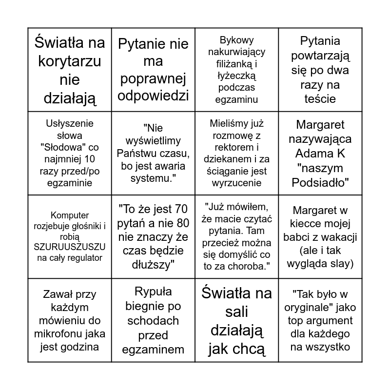 This bingo card has 16 words: Rypuła biegnie po schodach przed egzaminem, Margaret w kiecce mojej babci z wakacji (ale i tak wygląda slay), Bykowy nakurwiający filiżanką i łyżeczką podczas egzaminu, Światła na korytarzu nie działają, Komputer rozjebuje głośniki i robią SZURUUSZUSZU na cały regulator, Pytanie nie ma poprawnej odpowiedzi, "Już mówiłem, że macie czytać pytania. Tam przecież można się domyślić co to za choroba.", Światła na sali działają jak chcą, Usłyszenie słowa "Słodowa" co najmniej 10 razy przed/po egzaminie, "Nie wyświetlimy Państwu czasu, bo jest awaria systemu.", Zawał przy każdym mówieniu do mikrofonu jaka jest godzina, Pytania powtarzają się po dwa razy na teście, "To że jest 70 pytań a nie 80 nie znaczy że czas będzie dłuższy", Margaret nazywająca Adama K "naszym Podsiadło", Mieliśmy już rozmowę z rektorem i dziekanem i za ściąganie jest wyrzucenie and "Tak było w oryginale" jako top argument dla każdego na wszystko.