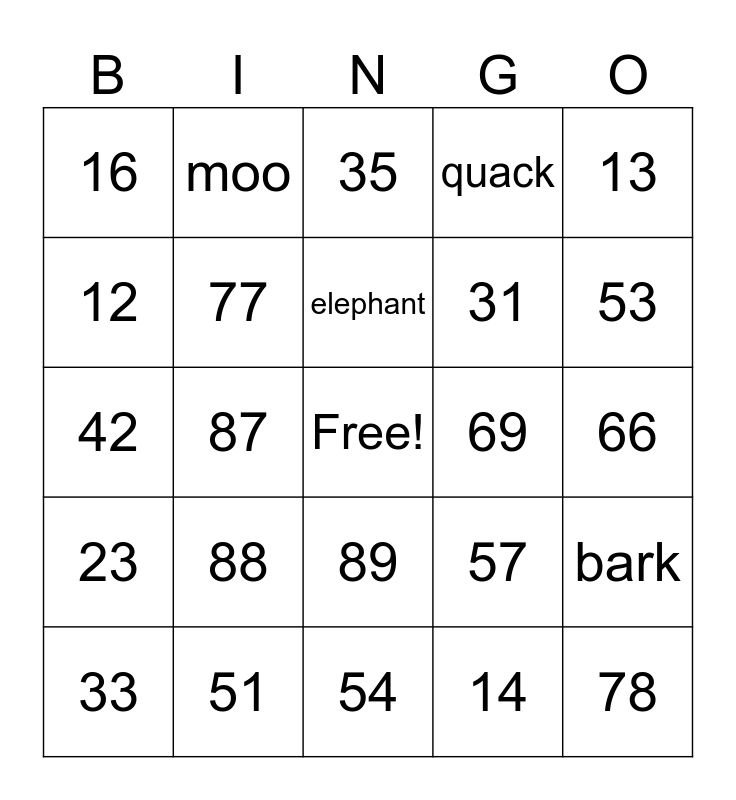 This bingo card has a free space and 29 words: 33, 56, 87, 97, 16, 35, 77, 88, 69, 51, 66, 78, 54, 14, 53, 7, 89, 23, 13, 42, 57, 80, 31, 12, quack, moo, bark, elephant and coo coo.
