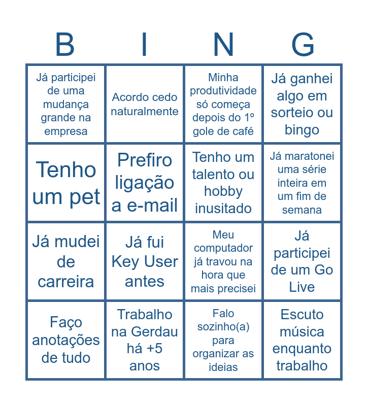 This bingo card has 20 words: Já participei de um Go Live, Já viajei para outro estado a trabalho, Minha produtividade só começa depois do 1º gole de café, Já criei vínculo com alguém só trabalhando remotamente, Faço anotações de tudo, Tenho um pet, Trabalho na Gerdau há +5 anos, Já participei de uma mudança grande na empresa, Já mudei de carreira, Acordo cedo naturalmente, Já fui Key User antes, Meu computador já travou na hora que mais precisei, Prefiro ligação a e-mail, Escuto música enquanto trabalho, Tenho um talento ou hobby inusitado, Gosto de listas, checklists e planner, Já maratonei uma série inteira em um fim de semana, Já ganhei algo em sorteio ou bingo, Falo sozinho(a) para organizar as ideias and Tenho filho(s).