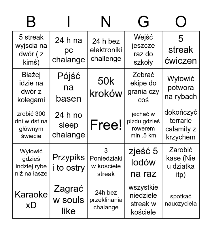 This bingo card has a free space and 24 words: Przypiks i to ostry, Zagrać w souls like, 50k kroków, Karaoke xD, 5 streak ćwiczen, 5 streak wyjscia na dwór ( z kimś), Błażej idzie na dwór z kolegami, 24 h na pc chalange, jechać w pizdu gdzieś rowerem min .5 km, 3 Poniedziaki w kościele streak, Zebrać ekipe do grania czy coś, zrobić 300 dni w dst na głównym świecie, zjeść 5 lodów na raz, Zarobić kase (Nie u dziatka itp), Pójść na basen, wszystkie niedziele streak w kościele, dokończyć terrarie calamity z krzychem, 24 h bez elektroniki challenge, Wyłowić potwora na rybach, 24 h no sleep chalange, spotkać nauczyciela, Wyłowić gdzieś indziej rybe niż na łasze, Wejść jeszcze raz do szkoły and 24h bez przeklinania chalange.