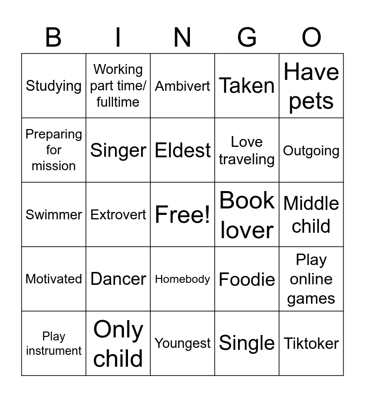This bingo card has a free space and 25 words: Dancer, Youngest, Eldest, Play instrument, Have pets, Studying, Preparing for mission, Working part time/ fulltime, Book lover, Homebody, Love traveling, Swimmer, Foodie, Play online games, Singer, Introvert, Middle child, Ambivert, Outgoing, Extrovert, Tiktoker, Only child, Motivated, Taken and Single.