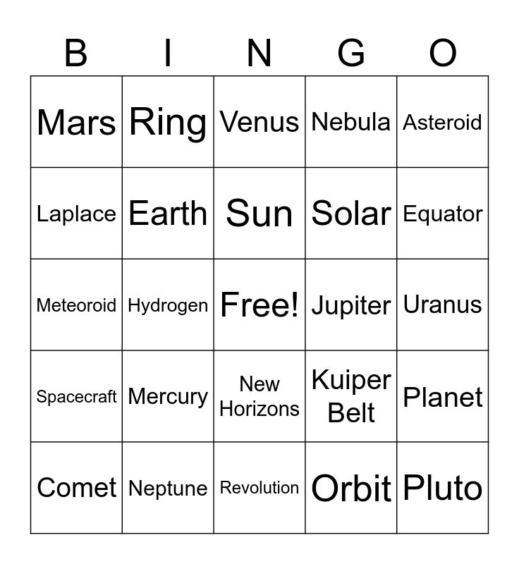 This bingo card has a free space and 29 words: Comet, Star, Hydrogen, Helium, Mars, Venus, Earth, Mercury, Jupiter, Neptune, Uranus, Pluto, Revolution, Orbit, Equator, Herschel, New Horizons, Spacecraft, Asteroid, Meteoroid, Kuiper Belt, Constellations, Solar, Laplace, Nebula, Ring, Planet, Sun and Moon.