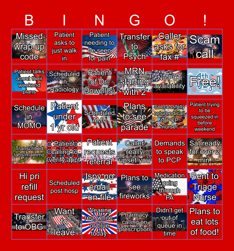 This bingo card has 30 images and 36 words: Plans to see fireworks, Ispy no email on file, Pharmacy calling on prescription, Patient talks about their weekend plans, Transcribed labs/mammo, Plans to see parade, Scheduled in Radiology, Wearing red, white, or blue today., Caller asks for fax #, Medication going through PA, Free!, Transfer to Psych, Sent to Triage Nurse, Patient under 1 yr old, MRN starting with 2, Missed wrap up code, Hi pri refill request, Successfully returned call to PCP nurse., Schedule in MOMO, Patient needing to be seen for pain, Scheduled AMV, Patient calling to verify appt, Caller really upset you, Patient requests referral, Demands to speak to PCP, Patient asks to just walk in, No PCT availability, Want to leave, Patient of Dr. Dowell(s), Scam call, Plans to eat lots of food!, Transfer to OBG, Sat ready for over 2 min., Patient trying to be squeezed in before weekend, Scheduled post hosp and Didn't get out of queue in time.