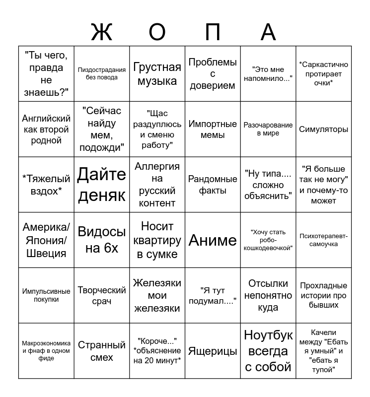 This bingo card has 36 words: "Я тут подумал....", Железяки мои железяки, Ящерицы, Английский как второй родной, Америка/Япония/Швеция, Рандомные факты, "Сейчас найду мем, подожди", "Короче..." *объяснение на 20 минут*, "Это мне напомнило...", Отсылки непонятно куда, Симуляторы, Проблемы с доверием, Прохладные истории про бывших, Дайте деняк, Импортные мемы, "Ты чего, правда не знаешь?", Импульсивные покупки, "Ну типа.... сложно объяснить", *Тяжелый вздох*, Грустная музыка, Аллергия на русский контент, Видосы на 6x, Аниме, Носит квартиру в сумке, "Хочу стать робо-кошкодевочкой", Пиздострадания без повода, Разочарование в мире, Странный смех, "Щас раздуплюсь и сменю работу", *Саркастично протирает очки*, Качели между "Ебать я умный" и "ебать я тупой", Макроэкономика и фнаф в одном фиде, Психотерапевт-самоучка, "Я больше так не могу" и почему-то может, Творческий срач and Ноутбук всегда с собой.