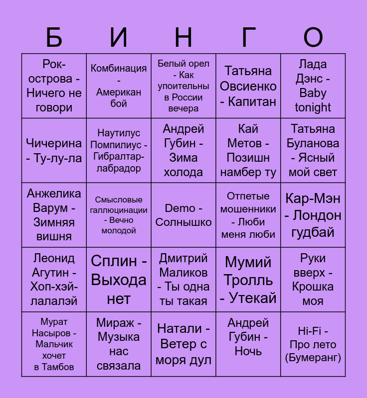 This bingo card has 25 words: Сплин - Выхода нет, Натали - Ветер с моря дул, Андрей Губин - Зима холода, Мурат Насыров - Мальчик хочет в Тамбов, Лада Дэнс - Baby tonight, Рок-острова - Ничего не говори, Чичерина - Ту-лу-ла, Комбинация - Американ бой, Отпетые мошенники - Люби меня люби, Дмитрий Маликов - Ты одна ты такая, Кай Метов - Позишн намбер ту, Анжелика Варум - Зимняя вишня, Мумий Тролль - Утекай, Руки вверх - Крошка моя, Наутилус Помпилиус - Гибралтар-лабрадор, Hi-Fi - Про лето (Бумеранг), Кар-Мэн - Лондон гудбай, Белый орел - Как упоительны в России вечера, Татьяна Буланова - Ясный мой свет, Смысловые галлюцинации - Вечно молодой, Demo - Солнышко, Мираж - Музыка нас связала, Леонид Агутин - Хоп-хэй-лалалэй, Татьяна Овсиенко - Капитан and Андрей Губин - Ночь.