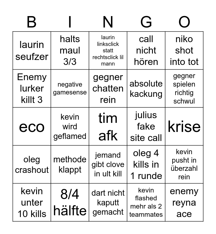 This bingo card has a free space and 24 words: methode klappt, 8/4 hälfte, gegner chatten rein, kevin unter 10 kills, niko shot into tot, laurin seufzer, Enemy lurker killt 3, halts maul 3/3, julius fake site call, jemand gibt clove in ult kill, absolute kackung, eco, oleg 4 kills in 1 runde, kevin pusht in überzahl rein, negative gamesense, kevin flashed mehr als 2 teammates, krise, laurin linksclick statt rechtsclick lil mann, gegner spielen richtig schwul, kevin wird geflamed, enemy reyna ace, oleg crashout, call nicht hören and dart nicht kaputt gemacht.