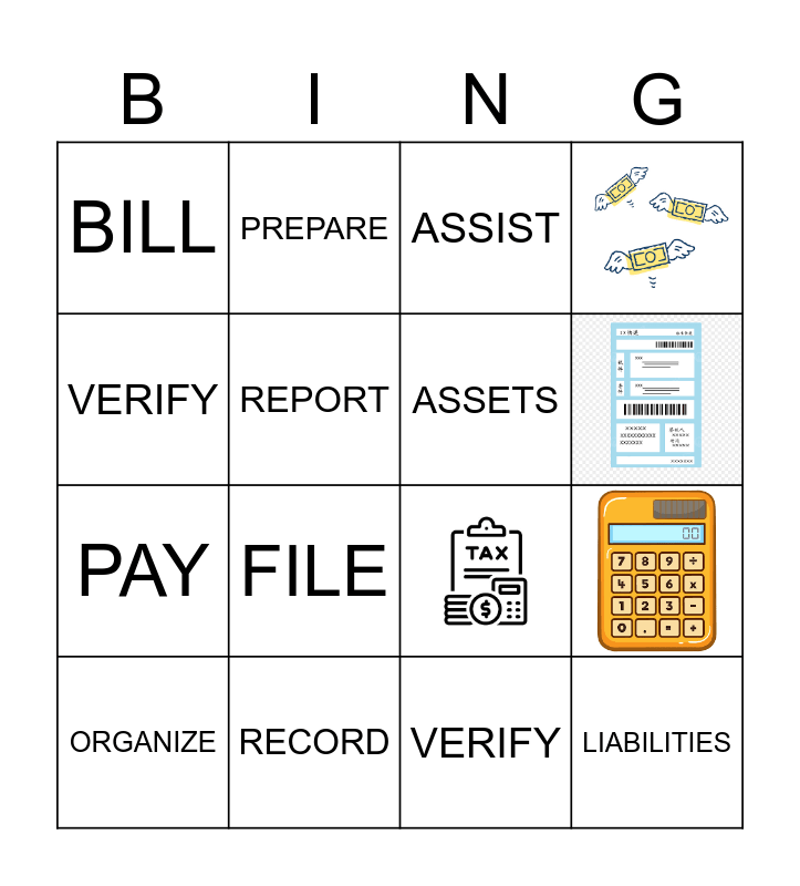 This bingo card has 4 images and 12 words: RECORD, ASSIST, BILL, PAY, PREPARE, VERIFY, VERIFY, REPORT, ORGANIZE, FILE, ASSETS and LIABILITIES.