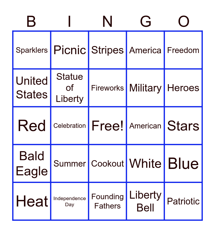 This bingo card has a free space and 24 words: Summer, Independence Day, Fireworks, Heat, Freedom, Sparklers, United States, Picnic, American, Cookout, Military, Red, White, Blue, Statue of Liberty, Liberty Bell, Stars, Stripes, Heroes, Celebration, Patriotic, Bald Eagle, America and Founding Fathers.