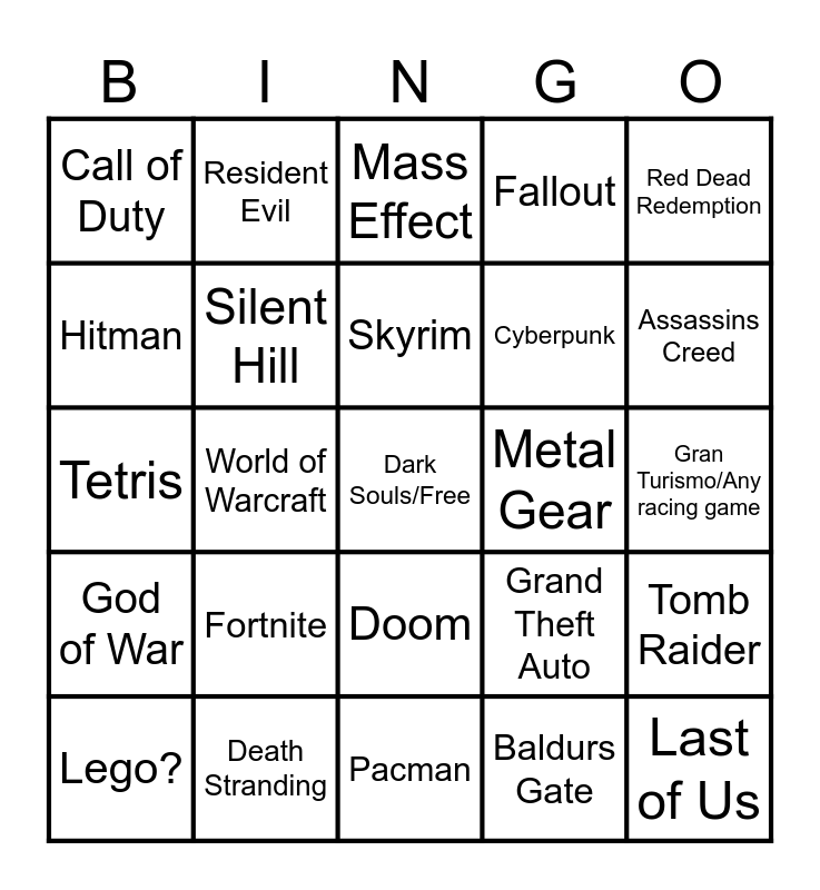 This bingo card has a free space and 24 words: Fortnite, Death Stranding, Skyrim, Lego?, Red Dead Redemption, Call of Duty, Hitman, Resident Evil, Metal Gear, Doom, Cyberpunk, Tetris, Grand Theft Auto, Tomb Raider, Silent Hill, Baldurs Gate, Gran Turismo/Any racing game, Mass Effect, Assassins Creed, World of Warcraft, Last of Us, God of War, Fallout and Pacman.