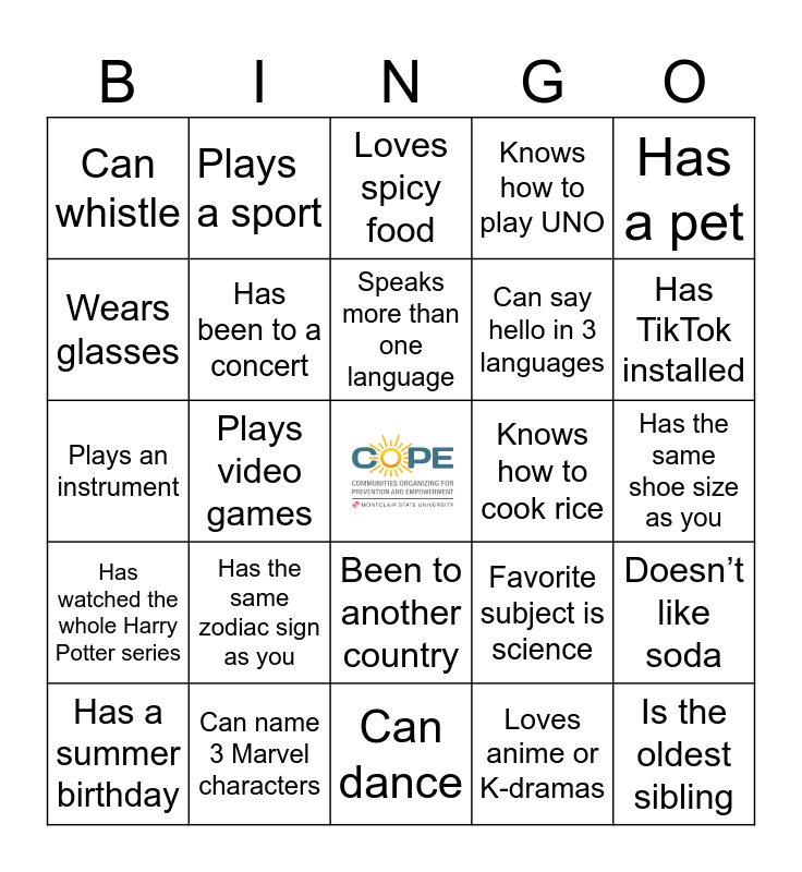 This bingo card has a free space and 24 words: Has the same zodiac sign as you, Can name 3 Marvel characters, Speaks more than one language, Has a summer birthday, Has a pet, Can whistle, Wears glasses, Plays a sport, Knows how to cook rice, Been to another country, Can say hello in 3 languages, Plays an instrument, Favorite subject is science, Doesn’t like soda, Has been to a concert, Loves anime or K-dramas, Has the same shoe size as you, Loves spicy food, Has TikTok installed, Plays video games, Is the oldest sibling, Has watched the whole Harry Potter series, Knows how to play UNO and Can dance.