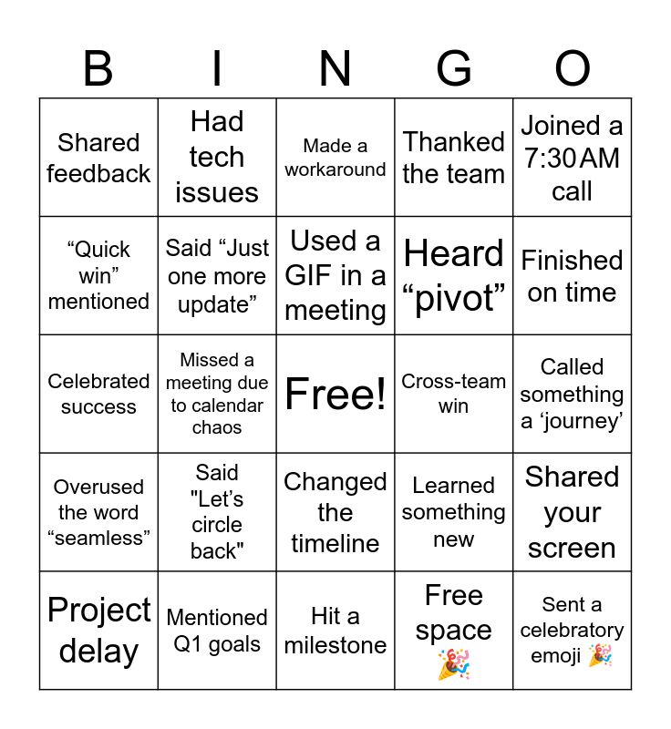 This bingo card has a free space and 25 words: Said "Let’s circle back", Hit a milestone, Used a GIF in a meeting, Project delay, Joined a 7:30 AM call, Shared feedback, “Quick win” mentioned, Had tech issues, Cross‑team win, Changed the timeline, Heard “pivot”, Celebrated success, Learned something new, Shared your screen, Said “Just one more update”, Added to the deck last‑minute, Called something a ‘journey’, Made a workaround, Finished on time, Missed a meeting due to calendar chaos, Sent a celebratory emoji 🎉, Mentioned Q1 goals, Overused the word “seamless”, Thanked the team and Free space 🎉.