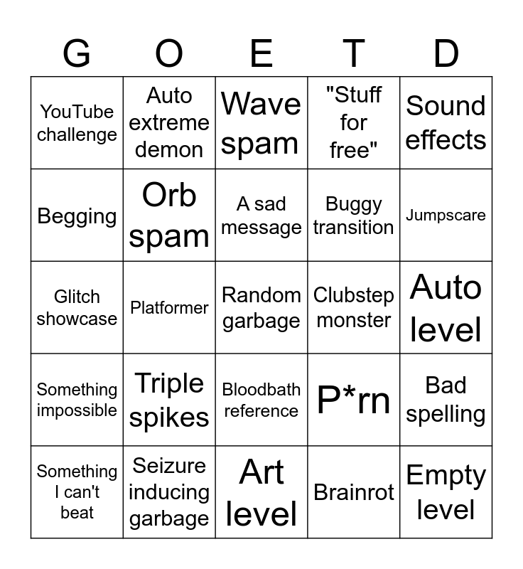 This bingo card has a free space and 29 words: Something I can't beat, Wave challenge, Platformer, Creo song, YouTube challenge, Wave spam, Orb spam, Triple spikes, Clubstep monster, Seizure inducing garbage, Auto level, Empty level, Art level, Brainrot, Jumpscare, Main level copy, Bloodbath reference, Something impossible, Sound effects, Glitch showcase, P*rn, Good gameplay, Buggy transition, Begging, "Stuff for free", Auto extreme demon, Bad spelling, A sad message and Bad spelling for the level name.