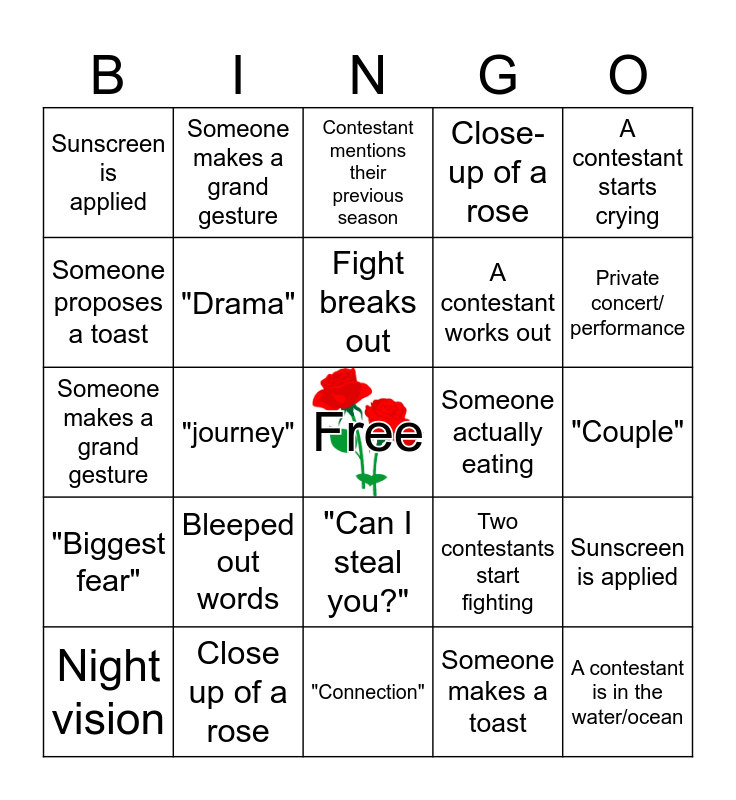 This bingo card has a free space and 29 words: Night vision, "Boom Boom Room", "journey", "jealous", Sunscreen is applied, Contestant mentions their previous season, "Drama", Bleeped out words, Someone actually eating, Close up of a rose, "Couple", A contestant is in the water/ocean, "Connection", Someone makes a toast, Private concert/ performance, Two contestants get interrupted, "Can I steal you?", "Biggest fear", A contestant starts crying, Someone makes a grand gesture, Two contestants start fighting, "I'm falling for...", A contestant works out, Someone proposes a toast, Close-up of a rose, Someone makes a grand gesture, Sunscreen is applied, Fight breaks out and Throwing shade in the shade.