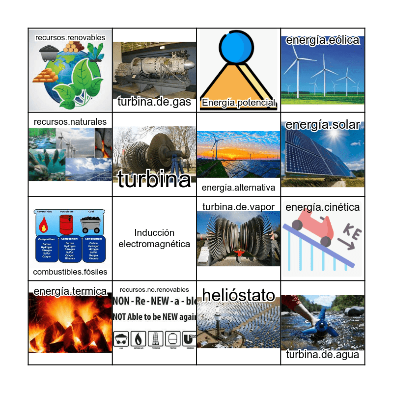 This bingo card has 18 images and 20 words: energía.cinética, Ley de la conservación de la energía, Energía.potencial, energía.radiante, energía.termica, recursos.naturales, recursos.no.renovables, recursos.renovables, combustibles.fósiles, turbina.de.gas, Inducción electromagnética, turbina.de.vapor, turbina, turbina.de.agua, energía.alternativa, energía hidroeléctrica, energía.solar, energía.eólica, helióstato and Planta.de.energía termico.solar.