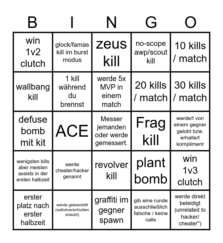 This bingo card has a free space and 24 words: werde cheater/hacker genannt, werde geteamkillt (selbstverschulden erlaubt), werde 5x MVP in einem match, erster platz nach erster halbzeit, 10 kills / match, win 1v2 clutch, wallbang kill, glock/famas kill im burst modus, Frag kill, revolver kill, 20 kills / match, defuse bomb mit kit, plant bomb, win 1v3 clutch, 1 kill während du brennst, gib eine runde ausschließlich falsche / keine calls, werde/t von einem gegner gelobt bzw. erhalte/t kompliment, zeus kill, 30 kills / match, ACE, werde direkt beleidigt (unrelated to hacker/ cheater"), wenigsten kills aber meisten assists in der ersten halbzeit, no-scope awp/scout kill and graffiti im gegner spawn.