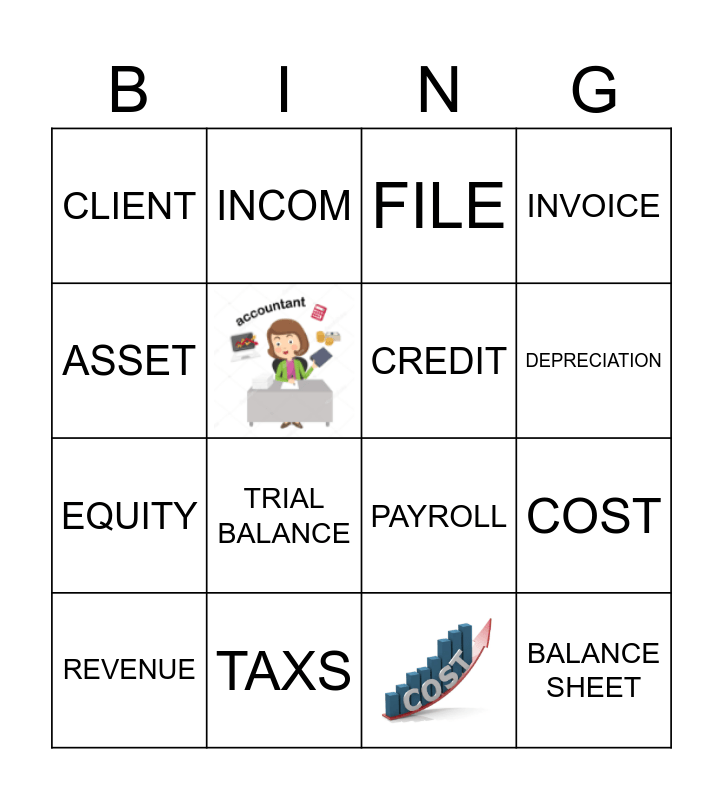 This bingo card has 2 images and 14 words: TAXS, COST, FILE, CLIENT, EQUITY, INCOM, PAYROLL, ASSET, REVENUE, INVOICE, TRIAL BALANCE, DEPRECIATION, CREDIT and BALANCE SHEET.