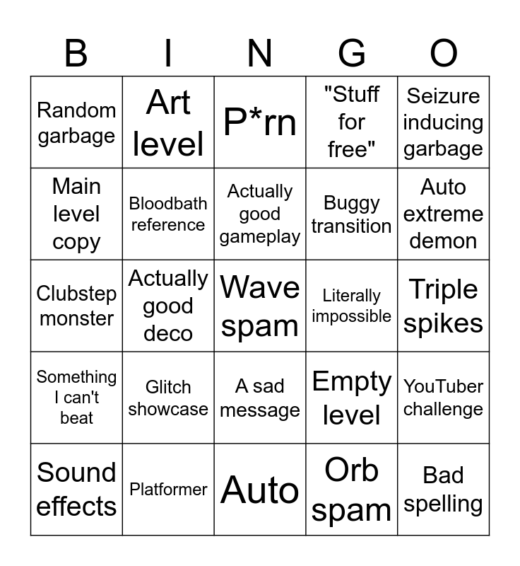 This bingo card has 25 words: Something I can't beat, Platformer, Wave spam, Orb spam, Seizure inducing garbage, Random garbage, Art level, P*rn, Literally impossible, YouTuber challenge, Main level copy, Bloodbath reference, Auto, Empty level, Auto extreme demon, Sound effects, Actually good deco, Actually good gameplay, Buggy transition, Triple spikes, Clubstep monster, Glitch showcase, A sad message, "Stuff for free" and Bad spelling.