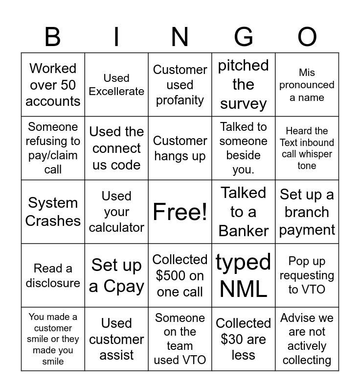 This bingo card has a free space and 24 words: Set up a Cpay, Used customer assist, Customer hangs up, You made a customer smile or they made you smile, Mis pronounced a name, Worked over 50 accounts, Someone refusing to pay/claim call, Used Excellerate, Talked to a Banker, Collected $500 on one call, Talked to someone beside you., System Crashes, typed NML, Pop up requesting to VTO, Used the connect us code, Collected $30 are less, Set up a branch payment, Customer used profanity, Heard the Text inbound call whisper tone, Used your calculator, Advise we are not actively collecting, Read a disclosure, pitched the survey and Someone on the team used VTO.