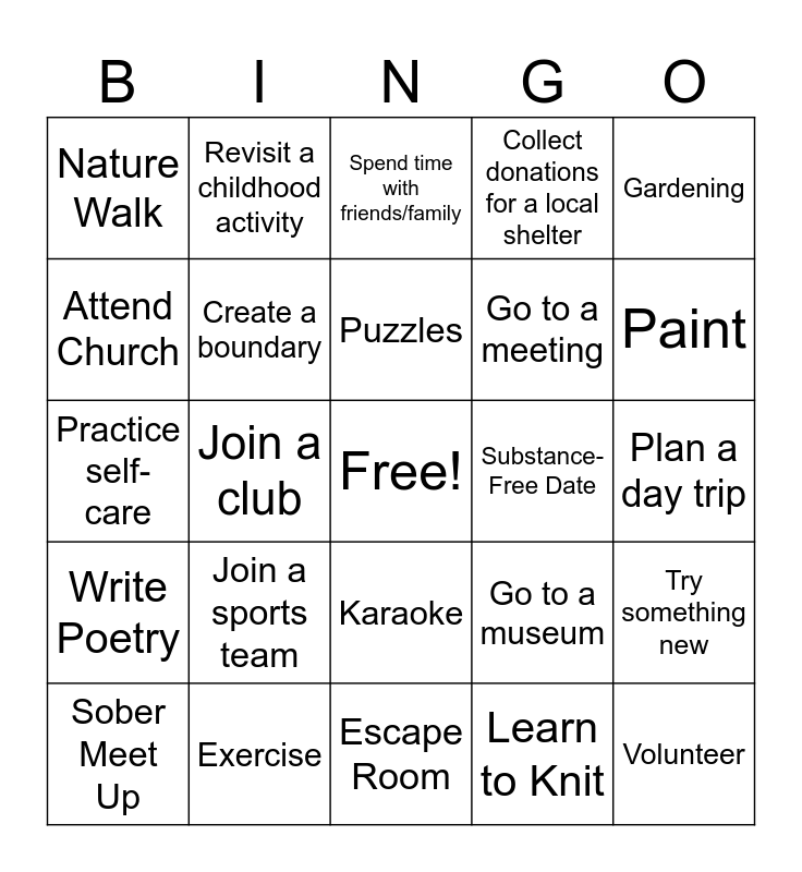 This bingo card has a free space and 59 words: Random act of kindness, Exercise, Practice Mindfulness, Write Poetry, Learn to Knit, Help a neighbor, Create a boundary, Clean your home, Go to a meeting, Help pick up trash at a local park, Collect donations for a local shelter, Ask to speak at a recovery center, Attend Church, Attend Bible Study, Create sidewalk art with chalk, Nature Walk, Volunteer, Gardening, Game Night, Puzzles, Substance-Free Date, Spend time with friends/family, Sober Meet Up, Try something new, Rock Climbing, Explore your family history, Learn a new skill, Take a new class, Paint, Draw, Scrapbook, Start a new hobby, Read a new book, Reconnect with a positive friend, Revisit a childhood activity, Go to an amusement park, Home Improvement project, Join a club, Spend time with animals, Practice self-care, Cooking or Baking, Join a sports team, Plan a day trip, Journal, Dance, Learn a musical instrument, Write music, Listen to music, Karaoke, Escape Room, Go Hiking, Camping, Plan a picnic, Visit a state park, Go to the beach, Go to a museum, Go to a comedy show, Go shopping and Go swimming.