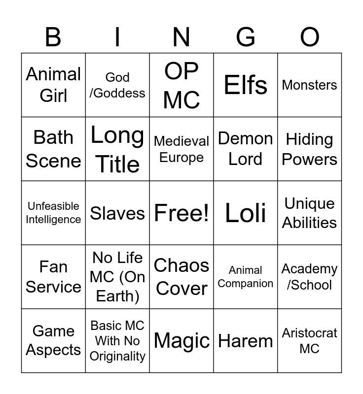 This bingo card has a free space and 24 words: No Life MC (On Earth), Basic MC With No Originality, Medieval Europe, Game Aspects, Monsters, Animal Girl, Bath Scene, God /Goddess, Loli, Chaos Cover, Demon Lord, Unfeasible Intelligence, Animal Companion, Academy /School, Long Title, Harem, Unique Abilities, OP MC, Hiding Powers, Slaves, Aristocrat MC, Fan Service, Elfs and Magic.