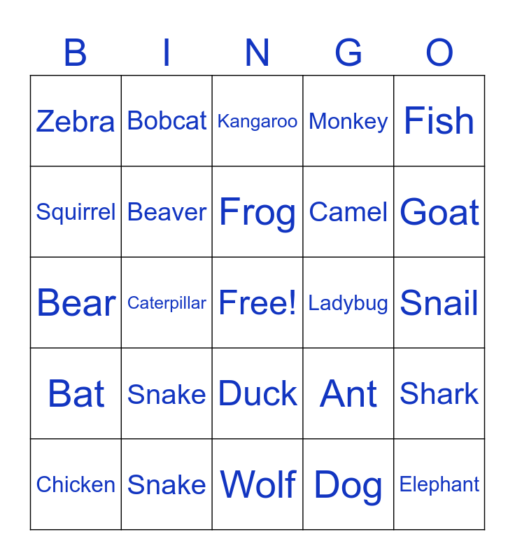 This bingo card has a free space and 44 words: Sloth, Elephant, Cow, Chicken, Cat, Dog, Kangaroo, Giraffe, Fish, Snake, Monkey, Ladybug, Duck, Snake, Fox, Wolf, Deer, Bear, Sheep, Goat, Bobcat, Tiger, Racoon, Zebra, Pig, Snail, Turtle, Butterfly, Ant, Bat, Bee, Shark, Whale, Horse, Caterpillar, Bird, Koala, Panda, Frog, Squirrel, Camel, Spider, Beaver and Alligator.