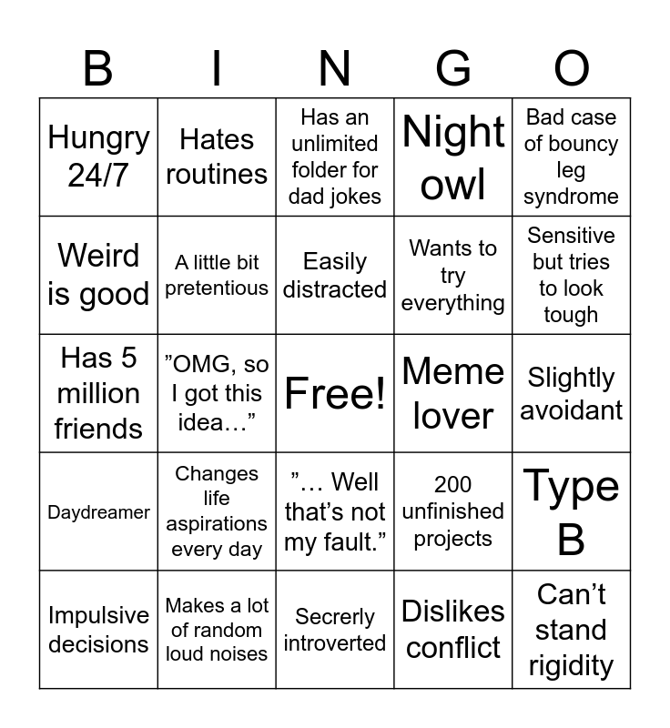 This bingo card has a free space and 24 words: Changes life aspirations every day, Makes a lot of random loud noises, Easily distracted, Impulsive decisions, Bad case of bouncy leg syndrome, Hungry 24/7, Weird is good, Hates routines, Meme lover, ”… Well that’s not my fault.”, Wants to try everything, Has 5 million friends, 200 unfinished projects, Type B, A little bit pretentious, Dislikes conflict, Slightly avoidant, Has an unlimited folder for dad jokes, Sensitive but tries to look tough, ”OMG, so I got this idea…”, Can’t stand rigidity, Daydreamer, Night owl and Secrerly introverted.
