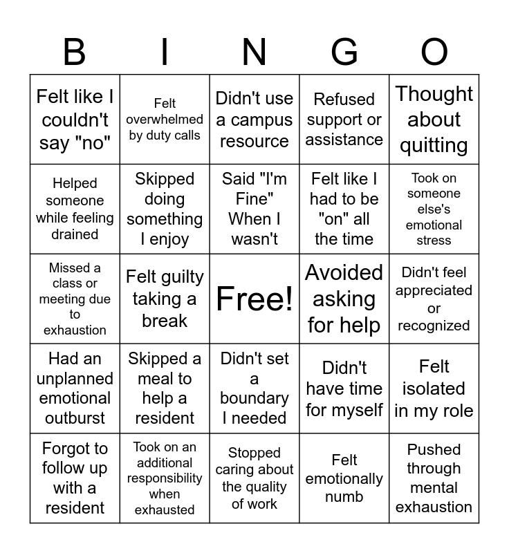 This bingo card has a free space and 24 words: Skipped a meal to help a resident, Took on an additional responsibility when exhausted, Said "I'm Fine" When I wasn't, Forgot to follow up with a resident, Thought about quitting, Felt like I couldn't say "no", Helped someone while feeling drained, Felt overwhelmed by duty calls, Avoided asking for help, Didn't set a boundary I needed, Felt like I had to be "on" all the time, Missed a class or meeting due to exhaustion, Didn't have time for myself, Felt isolated in my role, Skipped doing something I enjoy, Felt emotionally numb, Didn't feel appreciated or recognized, Didn't use a campus resource, Took on someone else's emotional stress, Felt guilty taking a break, Pushed through mental exhaustion, Had an unplanned emotional outburst, Refused support or assistance and Stopped caring about the quality of work.