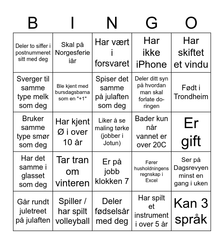 This bingo card has 30 words: Spiller / har spilt volleyball, Jobber med IT, Har kjent Ø i over 10 år, Har kjent K i over 10 år, Deler to siffer i postnummeret sitt med deg, Har vært i forsvaret, Ble kjent med bursdagsbarna som en "+1", Er på jobb klokken 7, Bader kun når vannet er over 20C, Deler fødselsår med deg, Er gift, Liker å se maling tørke (jobber i Jotun), Har spilt et instrument i over 5 år, Kan 3 språk, Født i Trondheim, Kan å plassere et bilde i et Word dokument, Fører husholdningens regnskap i Excel, Har det samme i glasset som deg, Tar tran om vinteren, Har skiftet et vindu, Bruker samme type smør som deg, Har vært i like mange kontinenter som deg, Skal på Norgesferie iår, Deler ditt syn på hvordan man skal forlate do-ringen, Sverger til samme type melk som deg, Har ikke iPhone, Ser på Dagsrevyen minst en gang i uken, Går rundt juletreet på julaften, Spiser det samme på julaften som deg and Samme favoritt musikk-sjanger som deg.