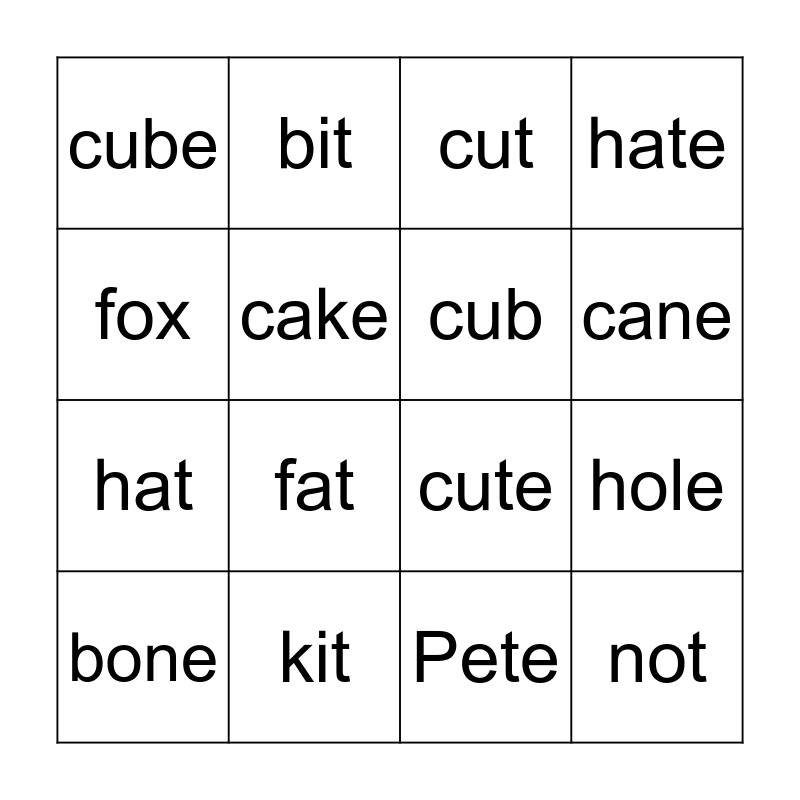 This bingo card has 21 words: kit, kite, bit, bite, Pete, cub, cube, cut, cute, cane, hat, hate, not, note, cake, cone, bone, fat, fox, hole and pet.