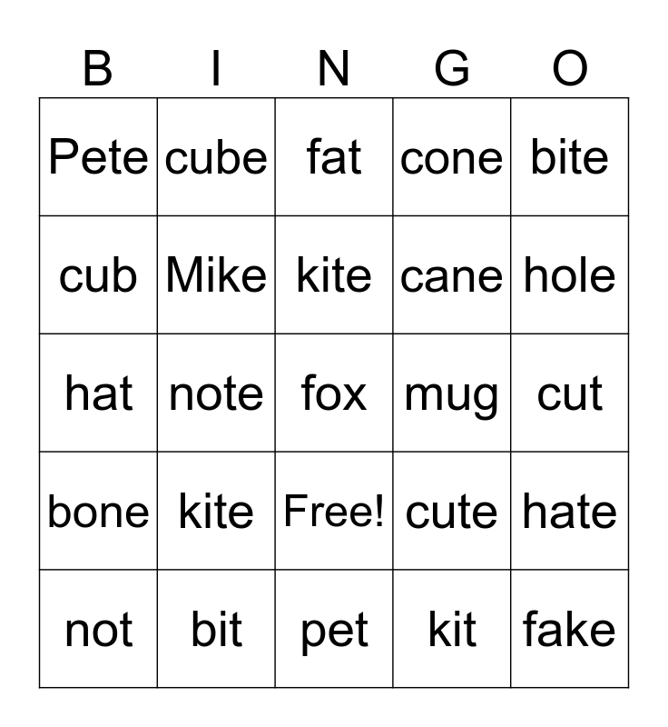 This bingo card has 26 words: Free!, kit, kite, bit, bite, Pete, cub, cube, cut, cute, cane, hat, hate, not, note, cake, cone, bone, fat, fox, hole, pet, mug, kite, Mike and fake.