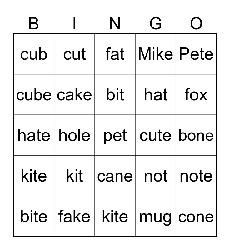 This bingo card has 25 words: kit, kite, bit, bite, Pete, cub, cube, cut, cute, cane, hat, hate, not, note, cake, cone, bone, fat, fox, hole, pet, fake, kite, Mike and mug.