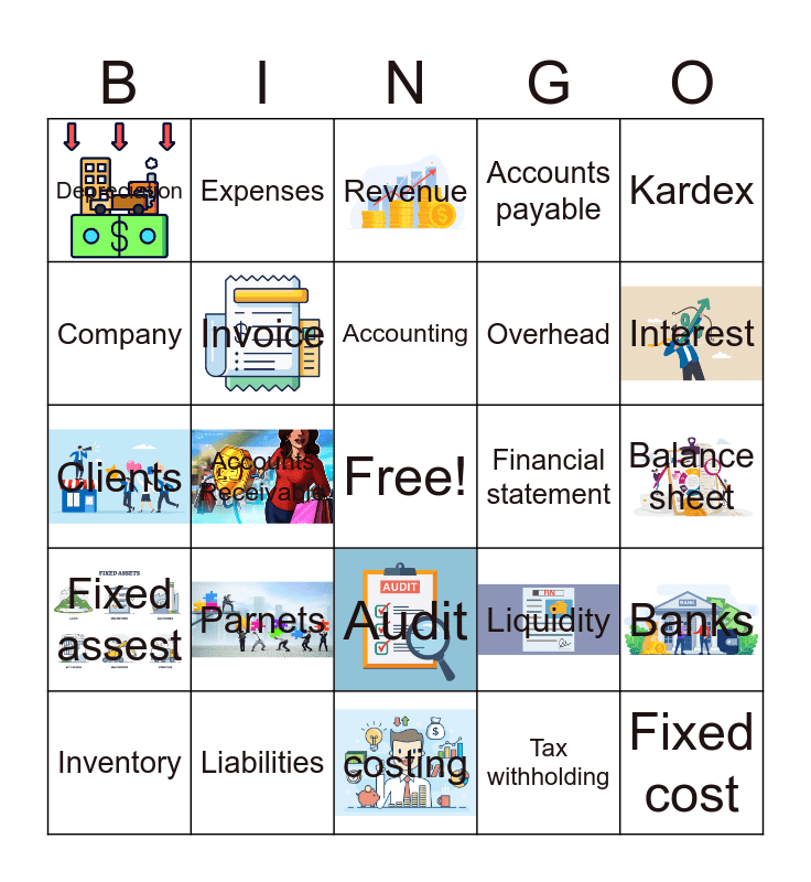 This bingo card has 22 images, a free space and 39 words: Account, Assets, Payroll, Invoice, Inventory, Audit, Accounting, Cash flow, Kardex, Fixed assest, Accounts Receivable, Accounts payable, Fixed cost, Balance sheet, Financial statement, Parnets, Calculator, Depreciation, Bank statement, Liquidity, Company, costing, Overhead, Interest, Labor reform, Cost, Credit, Debit, Equity, Expenses, VAT, Tax, Revenue, Liabilities, Tax withholding, Net prefic, Banks, Clients and DIAN.