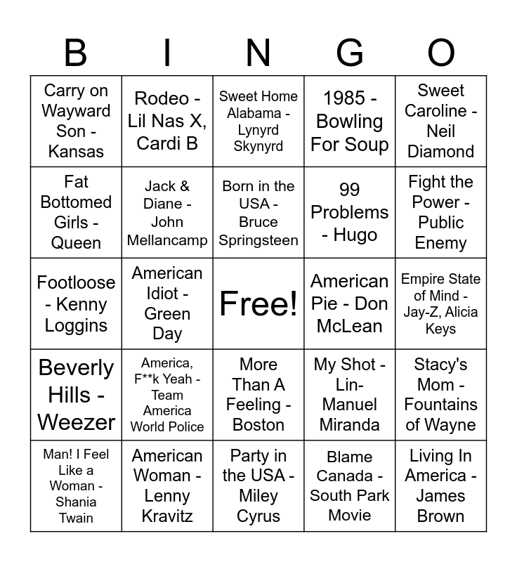 This bingo card has a free space and 30 words: American Woman - Lenny Kravitz, American Girl - Tom Petty & The Heartbreakers, American Idiot - Green Day, American Boy - Estelle, Somebody, Carry on Wayward Son - Kansas, Sweet Home Alabama - Lynyrd Skynyrd, Jack & Diane - John Mellancamp, More Than A Feeling - Boston, American Pie - Don McLean, Party in the USA - Miley Cyrus, Empire State of Mind - Jay-Z, Alicia Keys, Living In America - James Brown, Blame Canada - South Park Movie, This is America - Childish Gambino, Fight the Power - Public Enemy, Take Me Home, Country Road - John Denver, My Shot - Lin-Manuel Miranda, Beverly Hills - Weezer, America, F**k Yeah - Team America World Police, Sweet Caroline - Neil Diamond, Footloose - Kenny Loggins, Summer of '69 - Bryan Adams, Rodeo - Lil Nas X, Cardi B, 99 Problems - Hugo, Fat Bottomed Girls - Queen, 1985 - Bowling For Soup, Stacy's Mom - Fountains of Wayne, Man! I Feel Like a Woman - Shania Twain, Born in the USA - Bruce Springsteen and Viva Las Vegas - Elvis Presley.