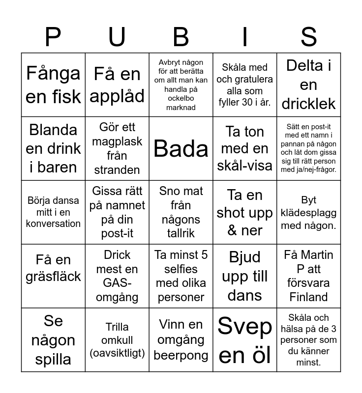 This bingo card has 25 words: Drick mest en GAS-omgång, Vinn en omgång beerpong, Bada, Se någon spilla, Delta i en dricklek, Fånga en fisk, Blanda en drink i baren, Få en applåd, Ta en shot upp & ner, Ta minst 5 selfies med olika personer, Ta ton med en skål-visa, Börja dansa mitt i en konversation, Bjud upp till dans, Få Martin P att försvara Finland, Gör ett magplask från stranden, Skåla och hälsa på de 3 personer som du känner minst., Byt klädesplagg med någon., Avbryt någon för att berätta om allt man kan handla på ockelbo marknad, Sätt en post-it med ett namn i pannan på någon och låt dom gissa sig till rätt person med ja/nej-frågor., Gissa rätt på namnet på din post-it, Sno mat från någons tallrik, Trilla omkull (oavsiktligt), Få en gräsfläck, Skåla med och gratulera alla som fyller 30 i år. and Svep en öl.