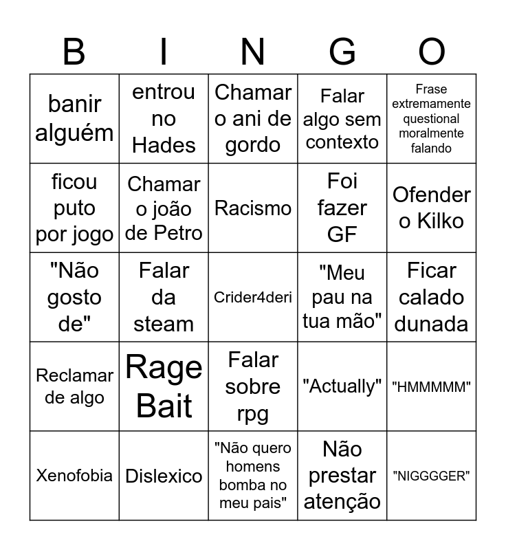 This bingo card has a free space and 24 words: Rage Bait, Dislexico, Racismo, Xenofobia, Frase extremamente questional moralmente falando, banir alguém, ficou puto por jogo, entrou no Hades, "Meu pau na tua mão", Falar sobre rpg, Foi fazer GF, "Não gosto de", "Actually", "HMMMMM", Chamar o joão de Petro, Não prestar atenção, Ficar calado dunada, Chamar o ani de gordo, Ofender o Kilko, Falar da steam, "NIGGGGER", Reclamar de algo, Falar algo sem contexto and "Não quero homens bomba no meu pais".