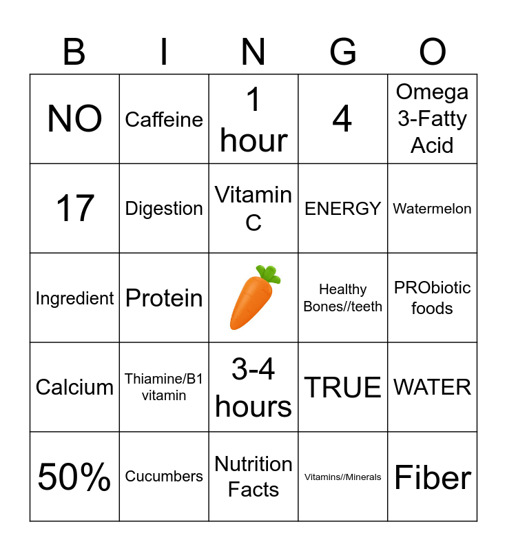 This bingo card has a free space and 29 words: 50%, Dopamine, Protein, FALSE, NO, 1 hour, Digestion, Thiamine/B1 vitamin, Healthy Bones//teeth, Cucumbers, PRObiotic foods, Fiber, Nutrition Facts, Vitamins//Minerals, Watermelon, PREbiotic foods, 3-4 hours, Calcium, Omega 3-Fatty Acid, Ingredient, TRUE, Jenny, ENERGY, 17, 4, Caffeine, WATER, Vitamin C and 5.