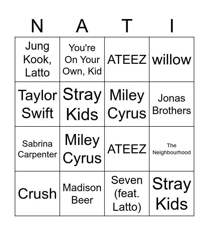 This bingo card has 234 words: Mind Over Matter (Reprise), Young the Giant, Anxiety, Doechii, Thunderous, Stray Kids, Hey Angel, One Direction, Walking in the Wind, One Direction, Bitter Sweet Symphony - Remastered 2016, The Verve, Guilty as Sin?, Taylor Swift, Come back to me, RM, Espresso, Sabrina Carpenter, Killin’ Me Good, JIHYO, DON QUIXOTE, SEVENTEEN, Smart, LE SSERAFIM, End of Beginning, Djo, Flowers, Miley Cyrus, Boyfriend, Dove Cameron, Easy Lover, Miley Cyrus, Messy, Lola Young, Taste, Sabrina Carpenter, Gnarly, KATSEYE, Good Luck, Babe!, Chappell Roan, Cruel Summer, Taylor Swift, Please Please Please, Sabrina Carpenter, Blank Space (Taylor's Version), Taylor Swift, Unwritten, Natasha Bedingfield, Moonlit Floor (Kiss Me), LISA, Make You Mine, Madison Beer, Seven (feat. Latto), Jung Kook, Latto, Dog Days Are Over, Florence + The Machine, Sweater Weather, The Neighbourhood, Nothing Breaks Like a Heart (feat. Miley Cyrus), Mark Ronson, Miley Cyrus, Another Love, Tom Odell, Flowers, Miley Cyrus, Lost on You, LP, Murder On The Dancefloor, Sophie Ellis-Bextor, Super, SEVENTEEN, HOT, SEVENTEEN, Rock with you, SEVENTEEN, LALALI, SEVENTEEN, Spell, SEVENTEEN, VERY NICE, SEVENTEEN, BOOMBOOM, SEVENTEEN, Don't Wanna Cry, SEVENTEEN, CLAP, SEVENTEEN, Ready to love, SEVENTEEN, God of Music, SEVENTEEN, Shadow, SEVENTEEN, God of Music, SEVENTEEN, Crush, SEVENTEEN, Don’t Blame Me, Taylor Swift, august, Taylor Swift, All Too Well (10 Minute Version) (Taylor's Version) (From The Vault), Taylor Swift, Look What You Made Me Do, Taylor Swift, Wildest Dreams (Taylor's Version), Taylor Swift, Karma, Taylor Swift, willow, Taylor Swift, Getaway Car, Taylor Swift, You're On Your Own, Kid, Taylor Swift, my tears ricochet, Taylor Swift, Guilty as Sin?, Taylor Swift, The Man, Taylor Swift, champagne problems, Taylor Swift, the 1, Taylor Swift, the last great american dynasty, Taylor Swift, September, Earth, Wind & Fire, GIANT (Korean Ver.), Stray Kids, Walkin On Water, Stray Kids, Chk Chk Boom, Stray Kids, Stray Kids, Stray Kids, LALALALA, Stray Kids, Cover Me, Stray Kids, S-Class, Stray Kids, TOPLINE (Feat. Tiger JK), Stray Kids, Tiger JK, CASE 143, Stray Kids, MANIAC, Stray Kids, VENOM, Stray Kids, Charmer, Stray Kids, Muddy Water (Changbin, Hyunjin, HAN, Felix), Stray Kids, CHEESE, Stray Kids, DOMINO, Stray Kids, Red Lights (Bang Chan, Hyunjin), Stray Kids, God’s Menu, Stray Kids, MIROH, Stray Kids, I am YOU, Stray Kids, Angels Like You, Miley Cyrus, The Climb, Miley Cyrus, See You Again, Miley Cyrus, The Driveway, Miley Cyrus, Fly On The Wall, Miley Cyrus, 7 Things - Single Version, Miley Cyrus, Can't Be Tamed, Miley Cyrus, Never Be Me, Miley Cyrus, Only Human, Jonas Brothers, Burnin' Up, Jonas Brothers, S.O.S., Jonas Brothers, Lovebug, Jonas Brothers, Hold On, Jonas Brothers, Paranoid, Jonas Brothers, Before The Storm (feat. Miley Cyrus), Jonas Brothers, Miley Cyrus, Born Again (feat. Doja Cat & RAYE), LISA, Doja Cat, RAYE, Darl+ing, SEVENTEEN, BOUNCY (K-HOT CHILLI PEPPERS), ATEEZ, Come back to me, RM, WORK, ATEEZ, Ice On My Teeth, ATEEZ, HALAZIA, ATEEZ, Crazy Form, ATEEZ, Guerrilla, ATEEZ, Lemon Drop, ATEEZ, ARRIBA, ATEEZ, IT's You (YEOSANG, SAN, WOOYOUNG), ATEEZ, Cyberpunk, ATEEZ, Deja Vu, ATEEZ, Summertime Sadness, Lana Del Rey, Cinnamon Girl, Lana Del Rey, Video Games, Lana Del Rey, Born To Die, Lana Del Rey, Brooklyn Baby and Lana Del Rey.