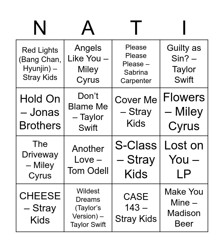 This bingo card has 114 words: Mind Over Matter (Reprise) – Young the Giant, Anxiety – Doechii, Thunderous – Stray Kids, Hey Angel – One Direction, Walking in the Wind – One Direction, Bitter Sweet Symphony (Remastered 2016) – The Verve, Guilty as Sin? – Taylor Swift, Come back to me – RM, Espresso – Sabrina Carpenter, Killin’ Me Good – JIHYO, DON QUIXOTE – SEVENTEEN, Smart – LE SSERAFIM, End of Beginning – Djo, Flowers – Miley Cyrus, Boyfriend – Dove Cameron, Easy Lover – Miley Cyrus, Messy – Lola Young, Taste – Sabrina Carpenter, Gnarly – KATSEYE, Good Luck, Babe! – Chappell Roan, Cruel Summer – Taylor Swift, Please Please Please – Sabrina Carpenter, Blank Space (Taylor’s Version) – Taylor Swift, Unwritten – Natasha Bedingfield, Moonlit Floor (Kiss Me) – LISA, Make You Mine – Madison Beer, Seven (feat. Latto) – Jungkook, Dog Days Are Over – Florence + The Machine, Sweater Weather – The Neighbourhood, Nothing Breaks Like a Heart (feat. Miley Cyrus) – Mark Ronson, Miley Cyrus, Another Love – Tom Odell, Flowers – Miley Cyrus, Lost on You – LP, Murder On The Dancefloor – Sophie Ellis-Bextor, Super – SEVENTEEN, HOT – SEVENTEEN, Rock with you – SEVENTEEN, LALALI – SEVENTEEN, Spell – SEVENTEEN, VERY NICE – SEVENTEEN, BOOMBOOM – SEVENTEEN, Don’t Wanna Cry – SEVENTEEN, CLAP – SEVENTEEN, Ready to love – SEVENTEEN, God of Music – SEVENTEEN, Shadow – SEVENTEEN, Crush – SEVENTEEN, Don’t Blame Me – Taylor Swift, august – Taylor Swift, All Too Well (10 Minute Version) (Taylor’s Version) (From The Vault) – Taylor Swift, Look What You Made Me Do – Taylor Swift, Wildest Dreams (Taylor’s Version) – Taylor Swift, Karma – Taylor Swift, willow – Taylor Swift, Getaway Car – Taylor Swift, You’re On Your Own, Kid – Taylor Swift, my tears ricochet – Taylor Swift, The Man – Taylor Swift, champagne problems – Taylor Swift, the 1 – Taylor Swift, the last great american dynasty – Taylor Swift, September – Earth, Wind & Fire, GIANT (Korean Ver.) – Stray Kids, Walkin On Water – Stray Kids, Chk Chk Boom – Stray Kids, Stray Kids – Stray Kids, LALALALA – Stray Kids, Cover Me – Stray Kids, S-Class – Stray Kids, TOPLINE (Feat. Tiger JK) – Stray Kids, Tiger JK, CASE 143 – Stray Kids, MANIAC – Stray Kids, VENOM – Stray Kids, Charmer – Stray Kids, Muddy Water (Changbin, Hyunjin, HAN, Felix) – Stray Kids, CHEESE – Stray Kids, DOMINO – Stray Kids, Red Lights (Bang Chan, Hyunjin) – Stray Kids, God’s Menu – Stray Kids, MIROH – Stray Kids, I am YOU – Stray Kids, Angels Like You – Miley Cyrus, The Climb – Miley Cyrus, See You Again – Miley Cyrus, The Driveway – Miley Cyrus, Fly On The Wall – Miley Cyrus, 7 Things (Single Version) – Miley Cyrus, Can’t Be Tamed – Miley Cyrus, Never Be Me – Miley Cyrus, Only Human – Jonas Brothers, Burnin’ Up – Jonas Brothers, S.O.S. – Jonas Brothers, Lovebug – Jonas Brothers, Hold On – Jonas Brothers, Paranoid – Jonas Brothers, Before The Storm (feat. Miley Cyrus) – Jonas Brothers, Miley Cyrus, Born Again (feat. Doja Cat & RAYE) – LISA, Doja Cat, RAYE, Darl+ing – SEVENTEEN, BOUNCY (K-HOT CHILLI PEPPERS) – ATEEZ, WORK – ATEEZ, Ice On My Teeth – ATEEZ, HALAZIA – ATEEZ, Crazy Form – ATEEZ, Guerrilla – ATEEZ, Lemon Drop – ATEEZ, ARRIBA – ATEEZ, IT’s You (YEOSANG, SAN, WOOYOUNG) – ATEEZ, Cyberpunk – ATEEZ, Deja Vu – ATEEZ, Summertime Sadness – Lana Del Rey, Cinnamon Girl – Lana Del Rey, Video Games – Lana Del Rey, Born To Die – Lana Del Rey and Brooklyn Baby – Lana Del Rey.