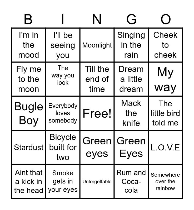 This bingo card has a free space and 24 words: Bicycle built for two, Smoke gets in your eyes, Till the end of time, Aint that a kick in the head, Cheek to cheek, I'm in the mood, Fly me to the moon, I'll be seeing you, Mack the knife, Green eyes, Dream a little dream, Bugle Boy, Green Eyes, L.O.V.E, The way you look, Rum and Coca-cola, The little bird told me, Moonlight, My way, Everybody loves somebody, Somewhere over the rainbow, Stardust, Singing in the rain and Unforgettable.