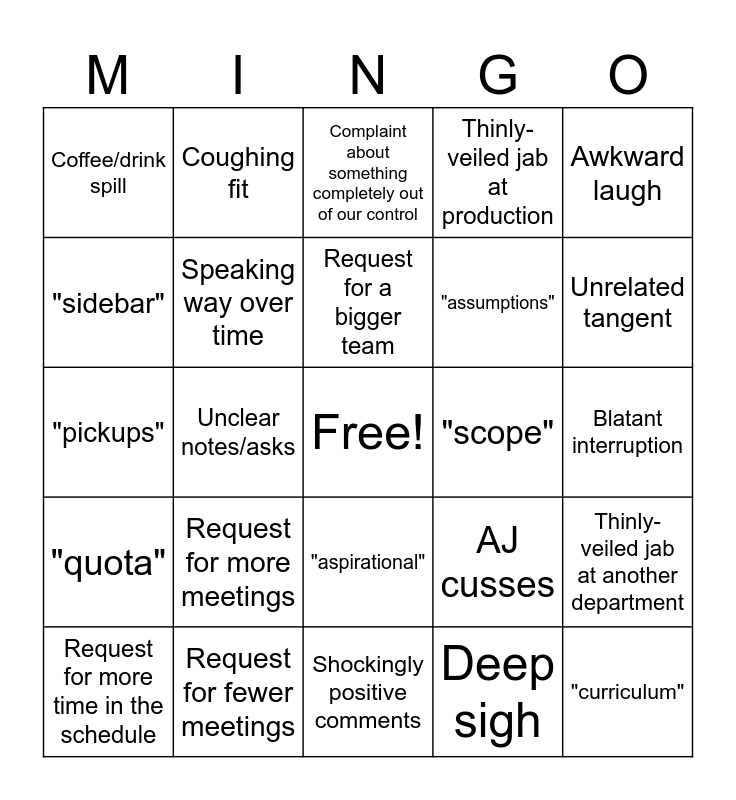 This bingo card has a free space and 24 words: Request for more meetings, Request for fewer meetings, Request for a bigger team, Request for more time in the schedule, Awkward laugh, Coffee/drink spill, "sidebar", Coughing fit, "scope", "aspirational", "assumptions", "pickups", AJ cusses, Thinly-veiled jab at another department, Speaking way over time, Deep sigh, Blatant interruption, Complaint about something completely out of our control, Unrelated tangent, Unclear notes/asks, "curriculum", "quota", Thinly-veiled jab at production and Shockingly positive comments.