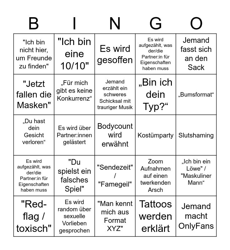 This bingo card has 25 words: "Du spielst ein falsches Spiel", "Man kennt mich aus Format XYZ", Jemand erzählt ein schweres Schicksal mit trauriger Musik, "Red-flag / toxisch", Jemand fasst sich an den Sack, "Ich bin nicht hier, um Freunde zu finden", "Jetzt fallen die Masken", "Ich bin eine 10/10", Kostümparty, "Sendezeit" / "Famegeil", „Bin ich dein Typ?“, „Du hast dein Gesicht verloren“, Zoom Aufnahmen auf einen twerkenden Arsch, „Ich bin ein Löwe" / "Maskuliner Mann“, „Für mich gibt es keine Konkurrenz“, Jemand macht OnlyFans, Slutshaming, Es wird gesoffen, „Bumsformat“, Es wird über Partner:innen gelästert, Bodycount wird erwähnt, Es wird random über sexuelle Vorlieben gesprochen, Es wird aufgezählt, was der/die Partner:in für Eigenschaften haben muss, Es wird aufgezählt, was der/die Partner:in für Eigenschaften haben muss and Tattoos werden erklärt.