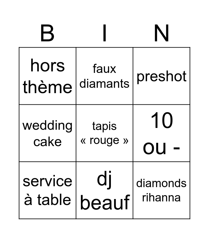 This bingo card has a free space and 8 words: 10 ou -, preshot, faux diamants, service à table, hors thème, diamonds rihanna, wedding cake and dj beauf.