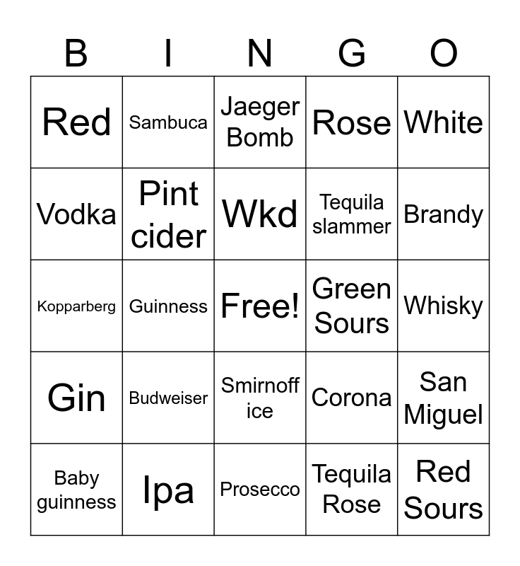This bingo card has a free space and 24 words: Budweiser, Ipa, Wkd, Baby guinness, White, Red, Vodka, Sambuca, Green Sours, Smirnoff ice, Tequila slammer, Kopparberg, Corona, San Miguel, Pint cider, Tequila Rose, Whisky, Jaeger Bomb, Brandy, Guinness, Red Sours, Gin, Rose and Prosecco.